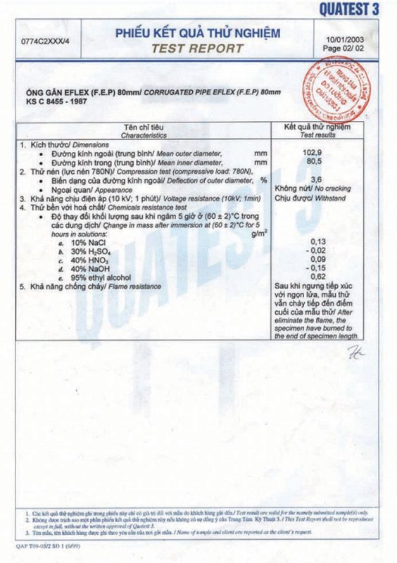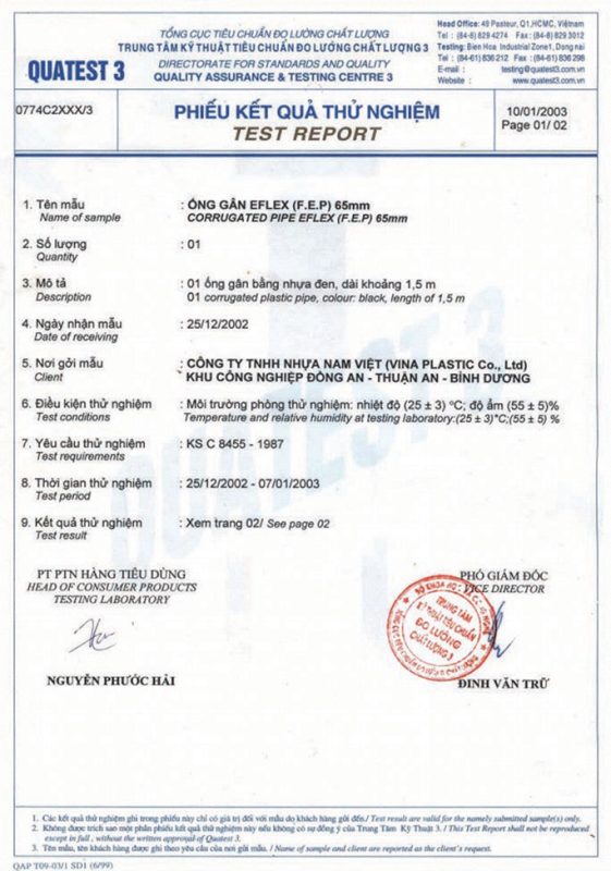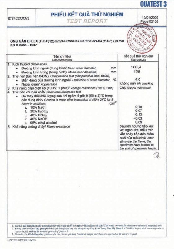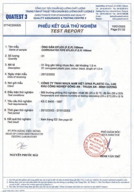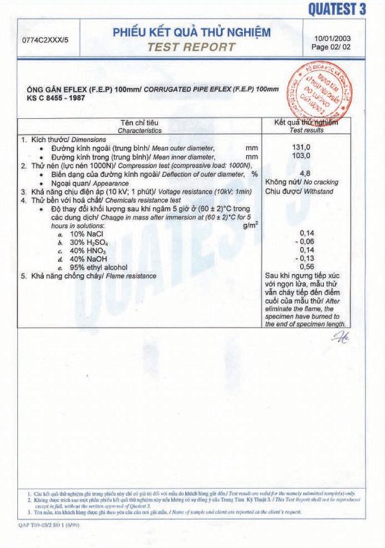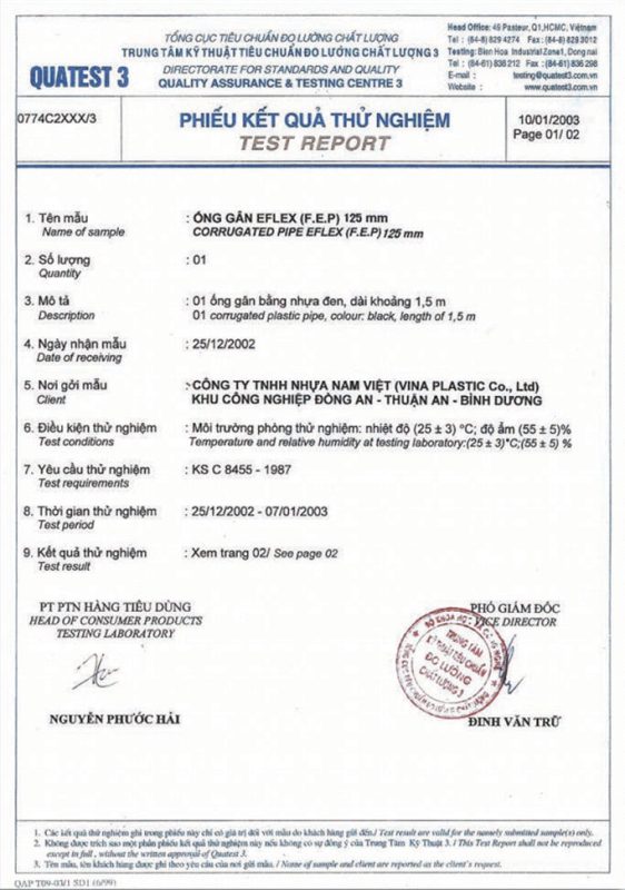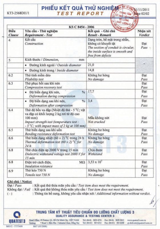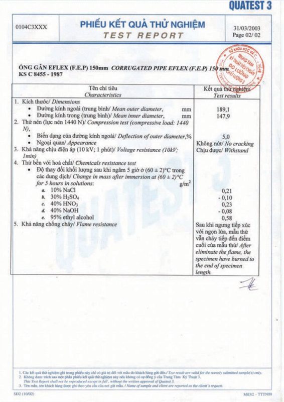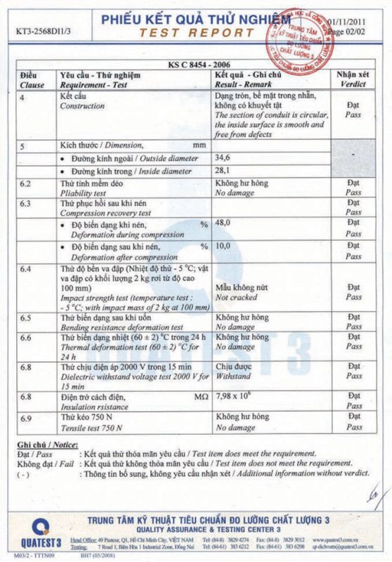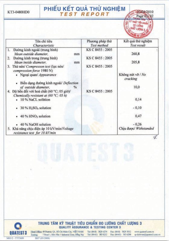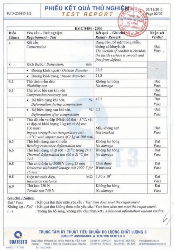 Các thử nghiệm dựa trên 9 QUATEST 3. KSC 8454-2006 (CD PIPE) KT3- 1160 D 19/1.2.3