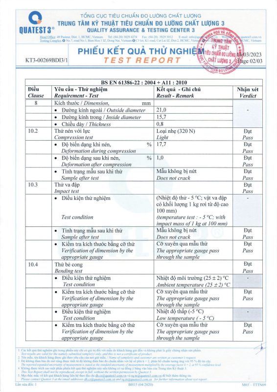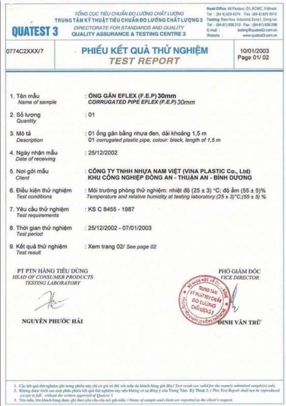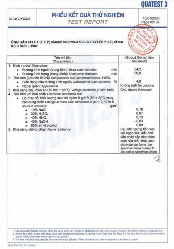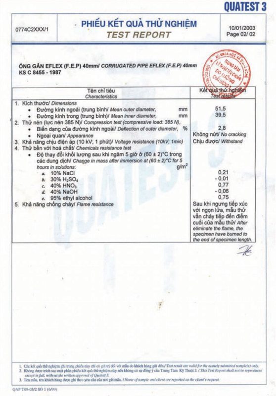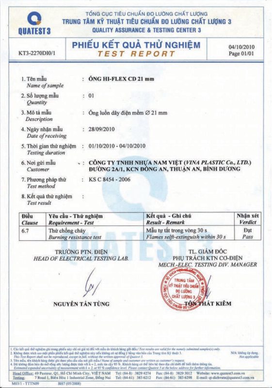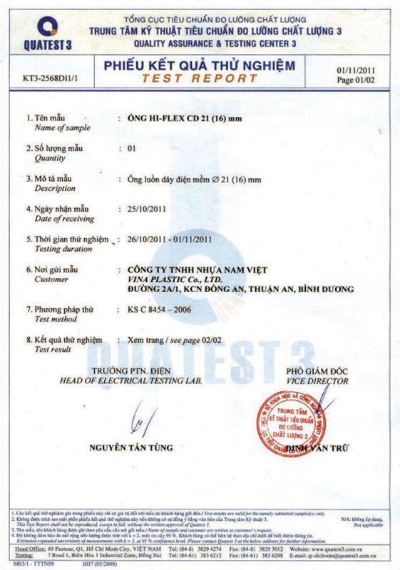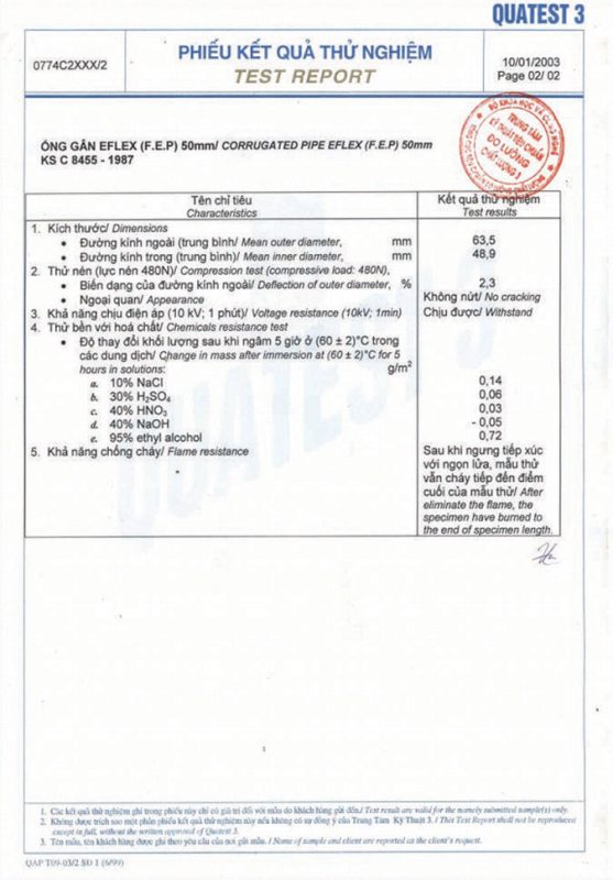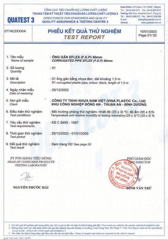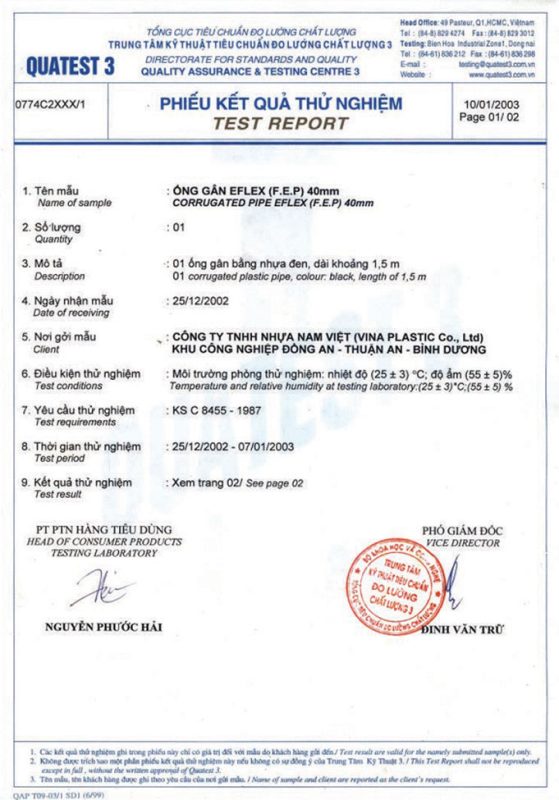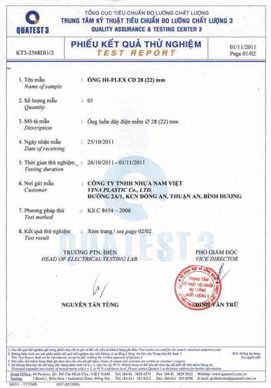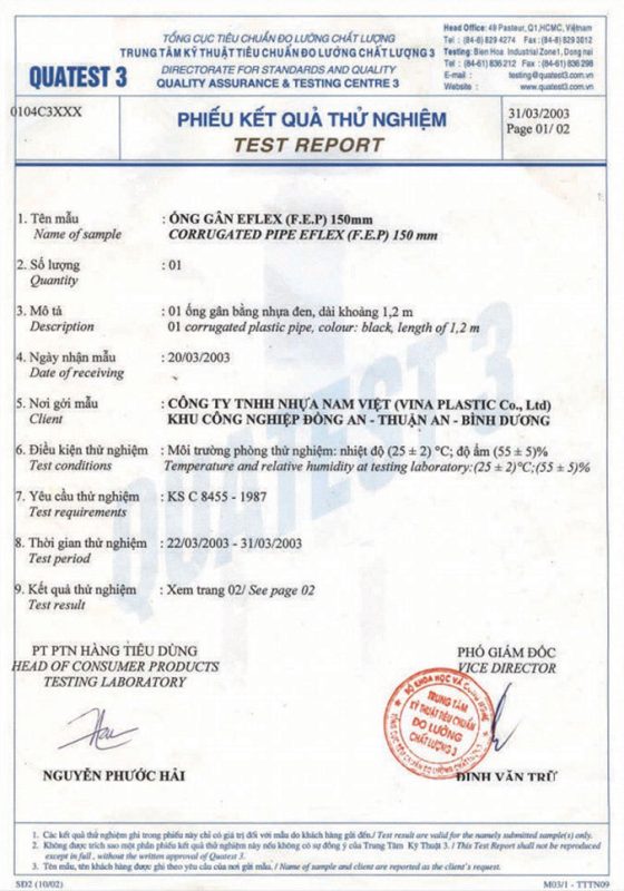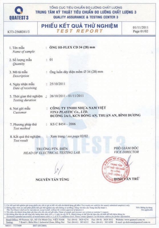 Các thử nghiệm dựa trên 9 QUATEST 3. KSC 8454-2006 (CD PIPE) KT3- 1160 D 19/1.2.3