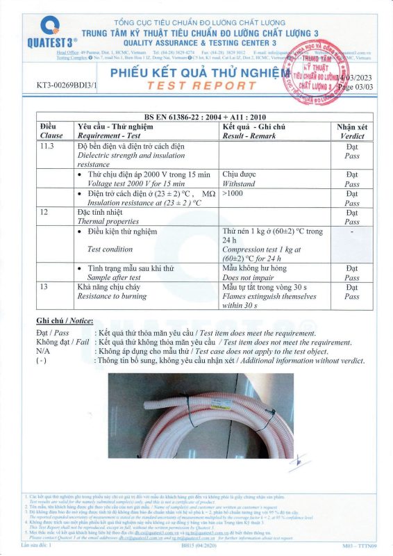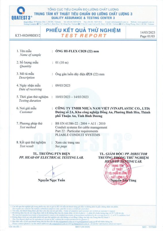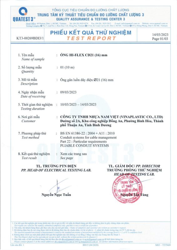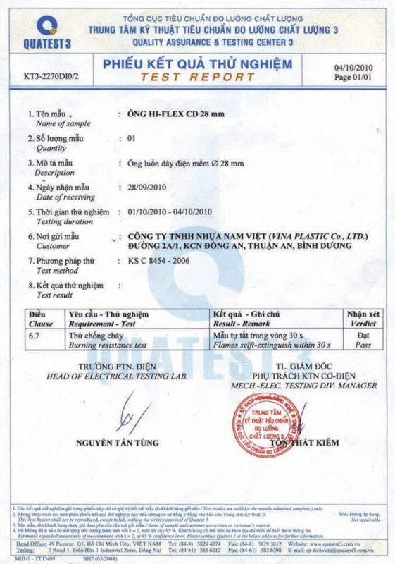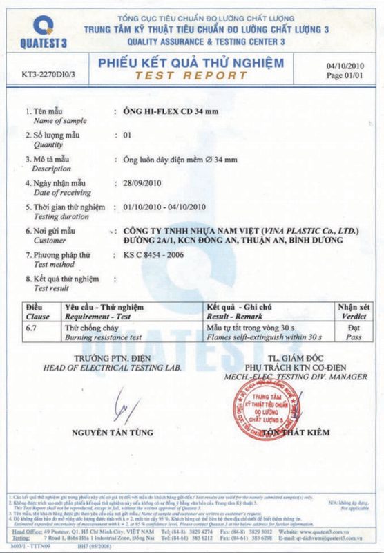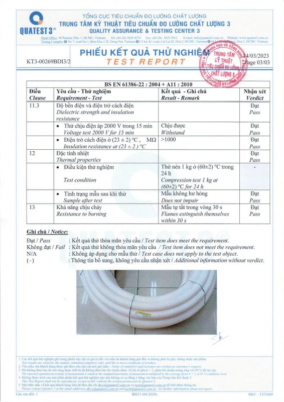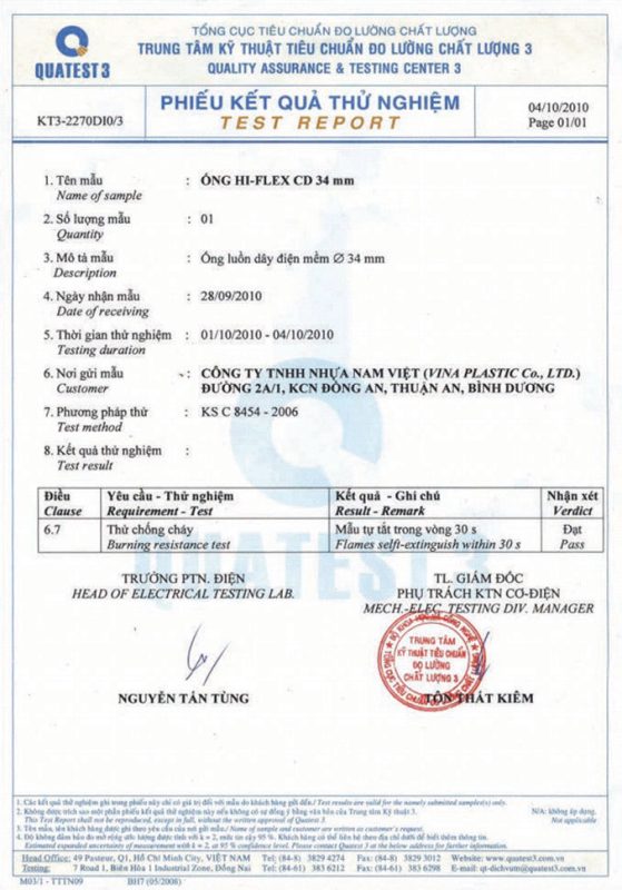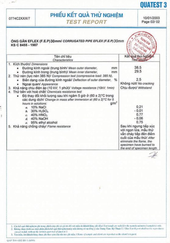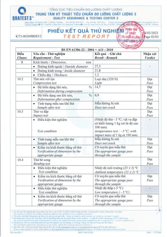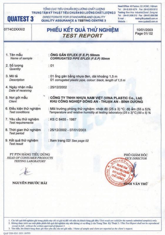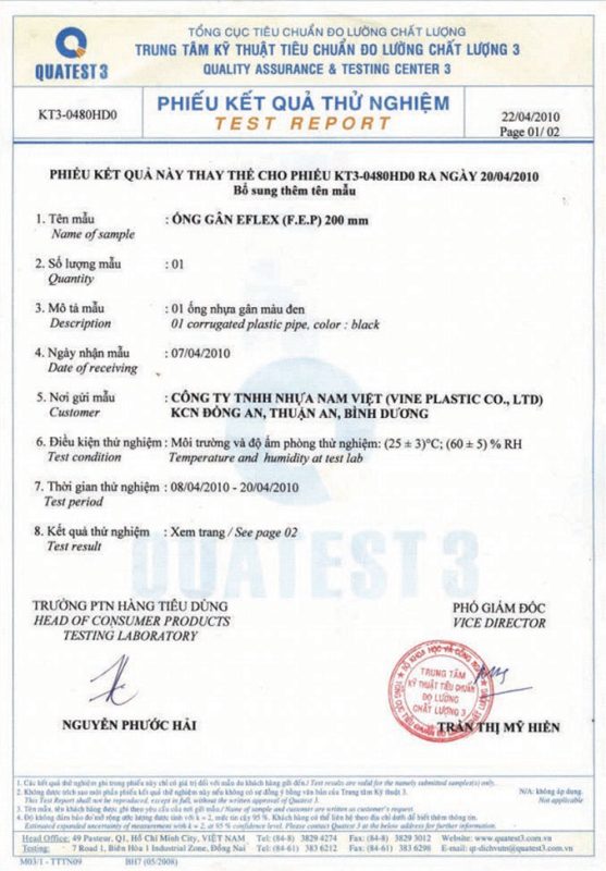 Các thử nghiệm dựa trên 9 QUATEST 3. KSC 8454-2006 (CD PIPE) KT3- 1160 D 19/1.2.3
