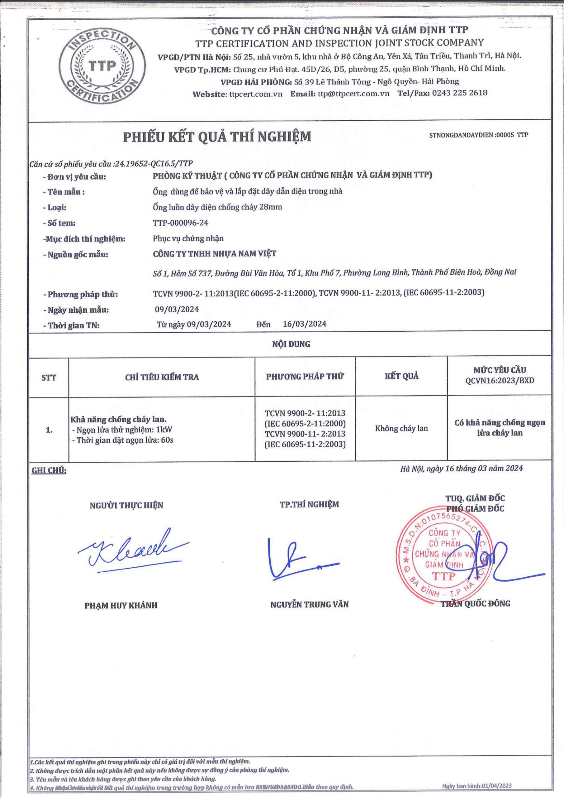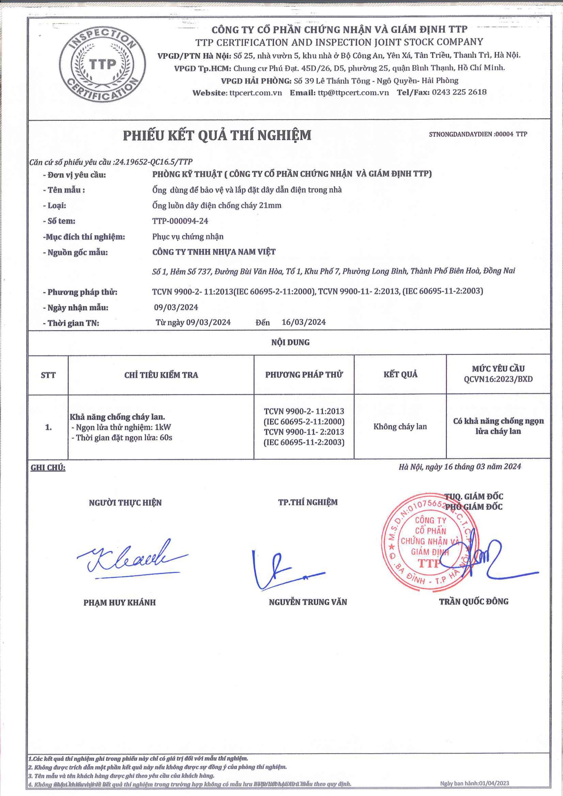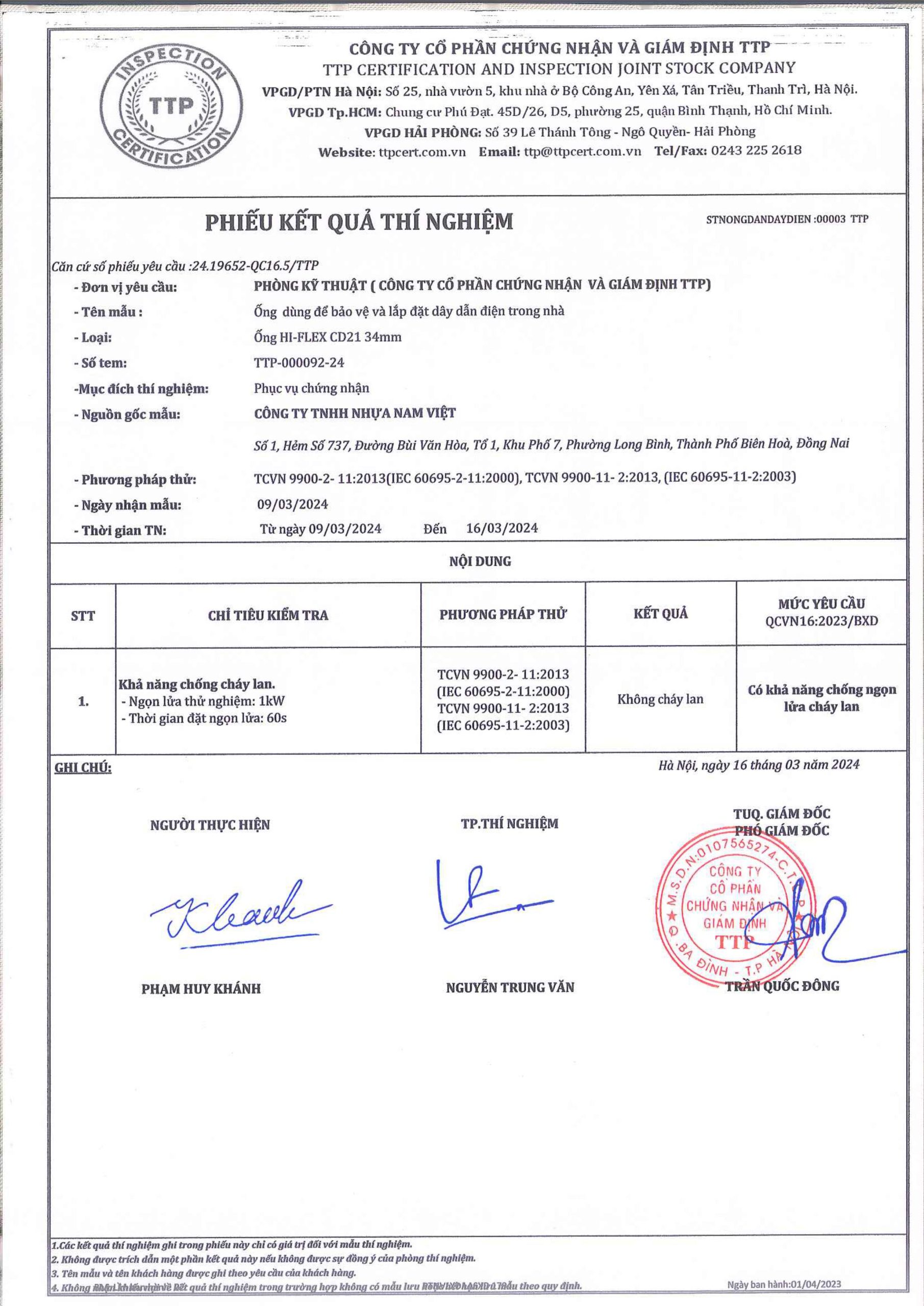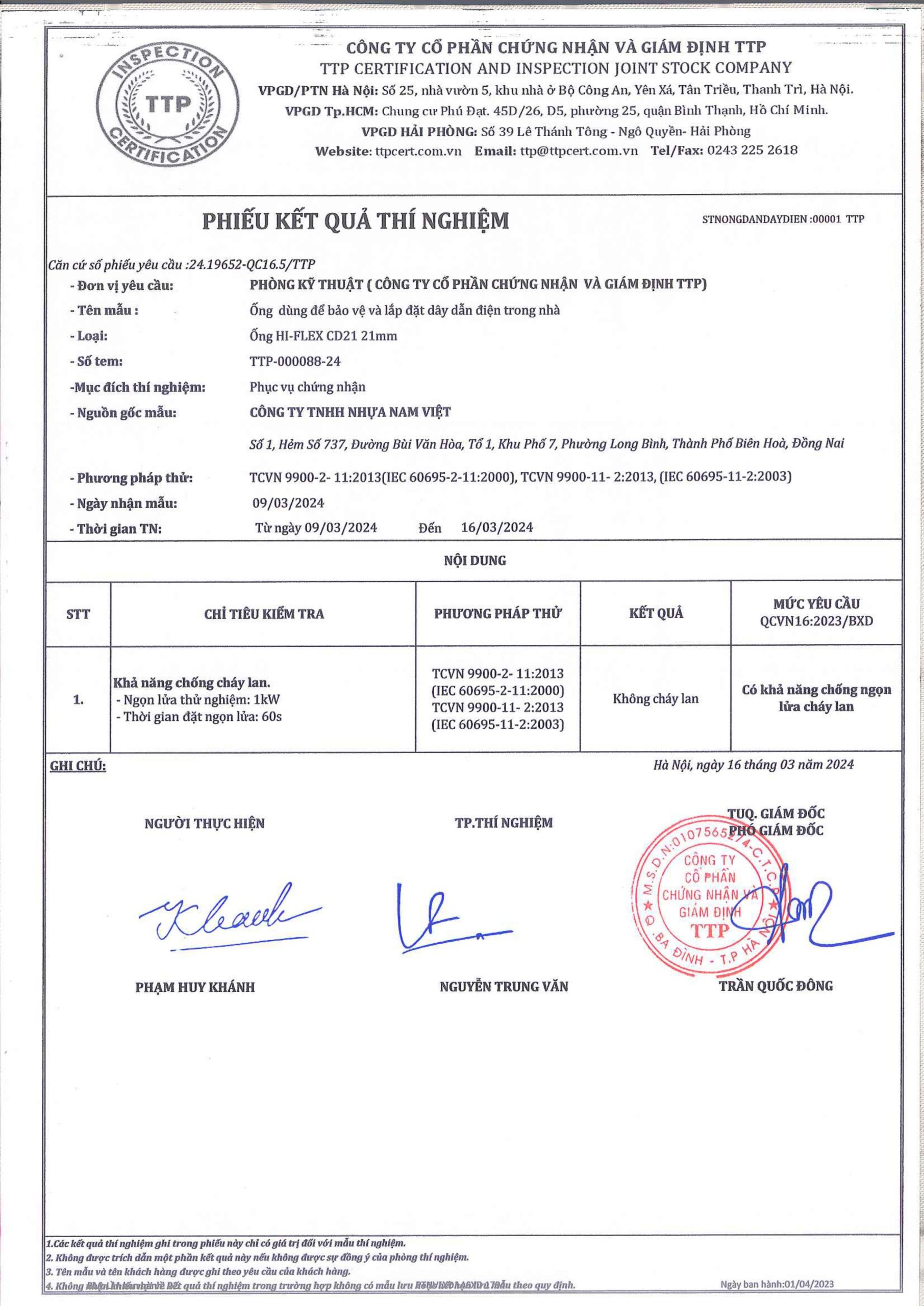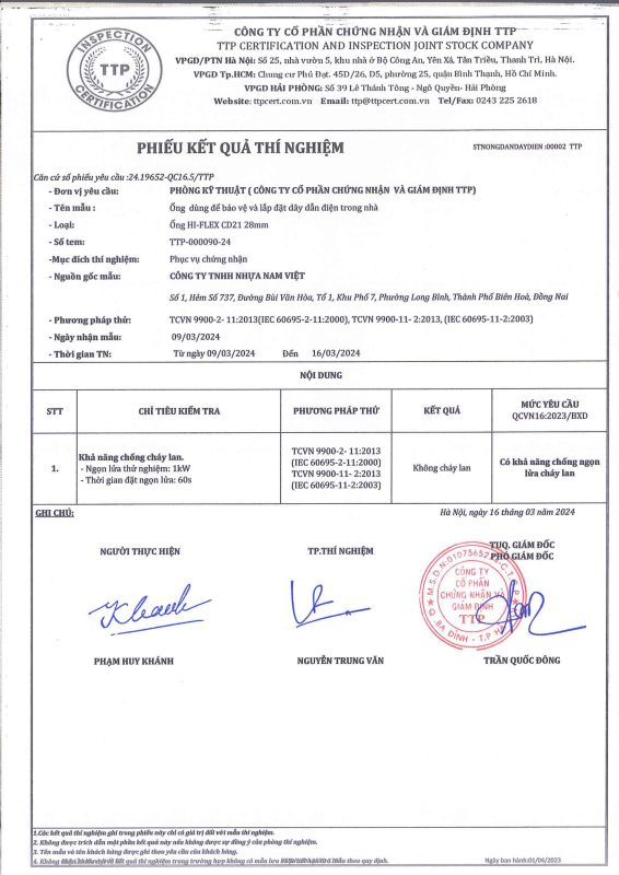 Các thử nghiệm dựa trên 9 QUATEST 3. KSC 8454-2006 (CD PIPE) KT3- 1160 D 19/1.2.3