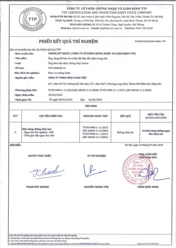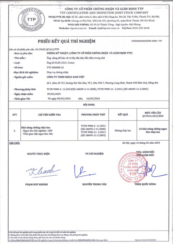 Bài kiểm tra chất chống cháy đạt qua CD (Viện Nghiên cứu & Kiểm định Hàn Quốc KSC 8454: 2006)